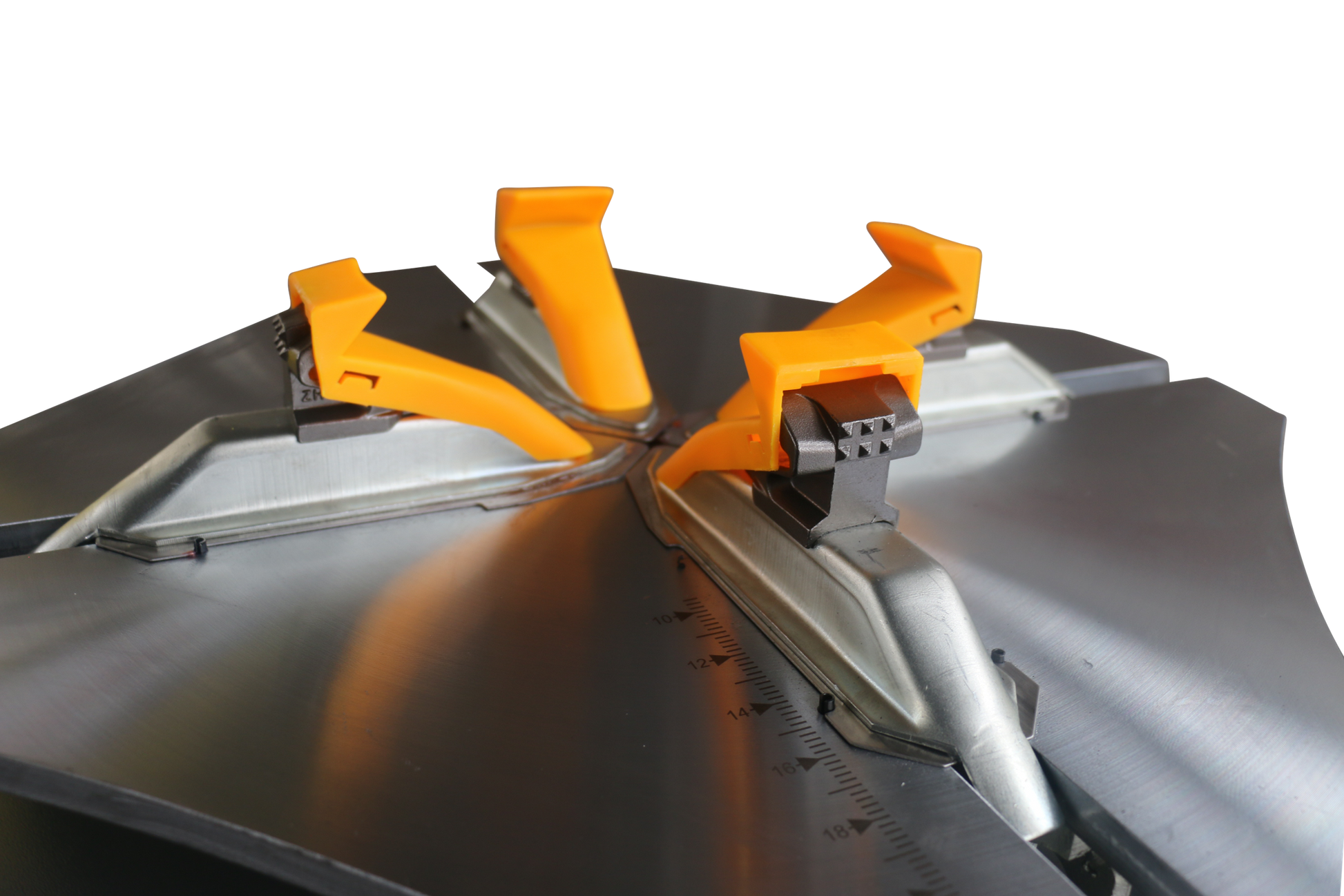- Self-centring four-jaw turntable controlled via two clamping cylinders for correct clamping of the wheel.